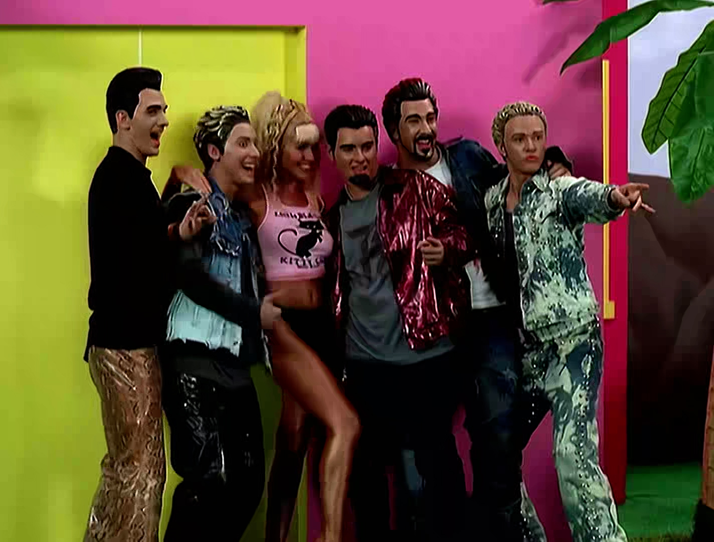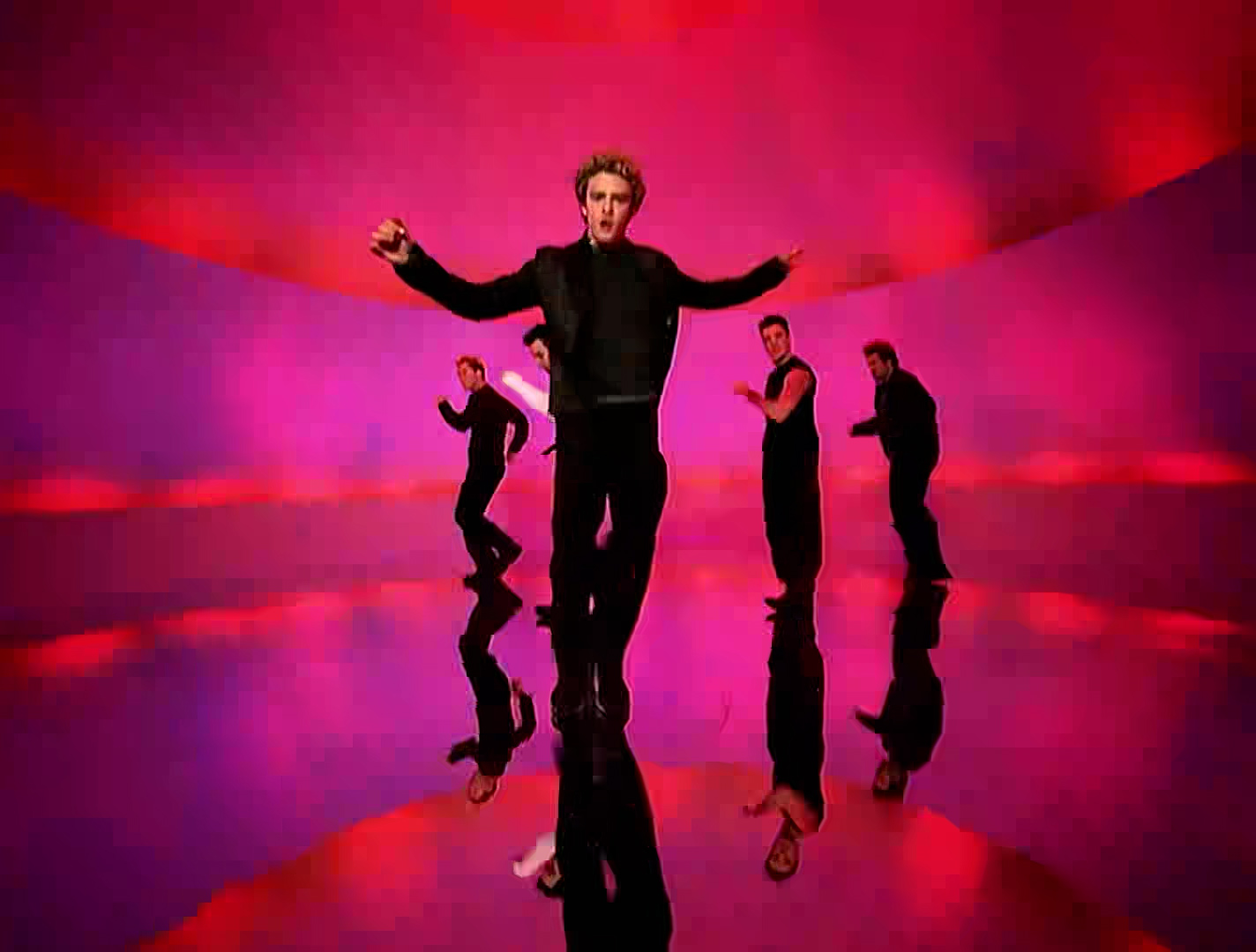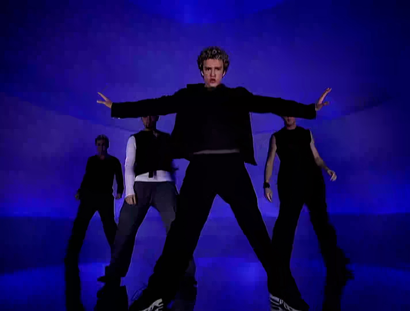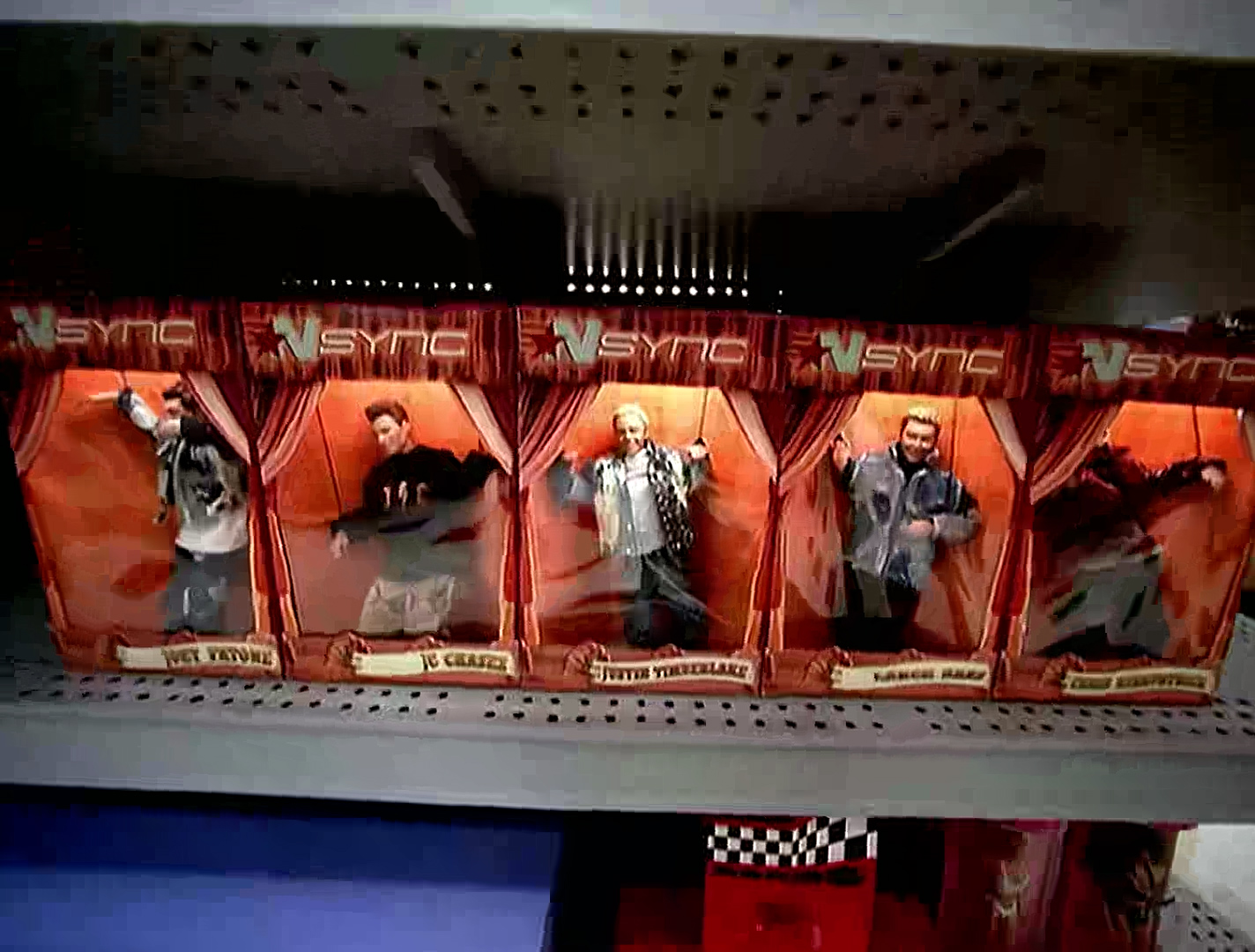 NSYNC were then placed against a green screen at the suggestion of Isham, after he saw a Slim Jim advertisement. The band were filmed at 12 frames per second, on a base of 24, to ensure that they resembled dolls. Consequently, both the song and dancing members needed to perform at half speed due to mathematical problems, which was also attributed to the set scaled 7.2 times larger than the real world. During the scene when the dolls are scanned at the checkout counter and reverted to human size, several shots of each member were superimposed in front of a green screen, which was animated by Radium through the use of Inferno steadily growing each doll back up to human height. The company also assisted in creating digital effects using Inferno, such as the constant “morph zooms” used to transition between scenes.[51] The music video debuted on MTV’s Making the Video on May 21, 2000,[53] and also made its first appearance on Total Request Live on May 23, 2000.[50]