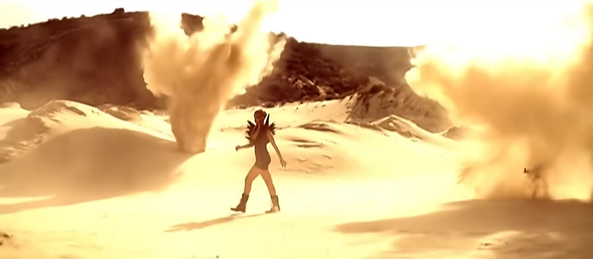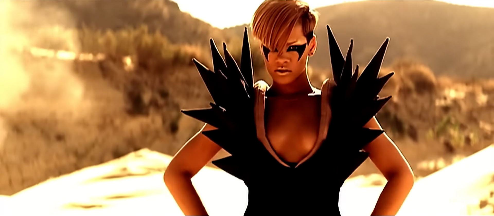 The video’s first scene is set in a desert at night. Rihanna, wearing a garrison cap, sunglasses, and a stylized white top, stands in front of an army. This scene is intercut with scenes of Rihanna in a bunker; she wears an army hard hat, pink lace up boots, and a skin-colored top with small black rectangles covering her breasts. Halfway through the first verse, the scene changes to a daytime desert scene in which Rihanna wears a low cut, short black dress with spiked shoulder pads, and walks through the location as small explosions occur around her.