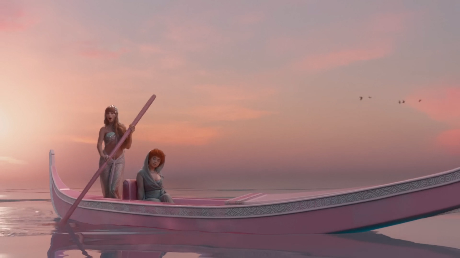 Directed by Swift herself, the video places the pop star in a variety of unusual locations: inside a lightbulb, trapped in an hourglass, atop a Wizard of Oz–themed storybook with a yellow brick road. She’s later joined by Ice Spice, and the two lasso planets together, row in a boat across an ocean, and serenade one another as the mountains (Swift) and the clouds (Ice Spice).
