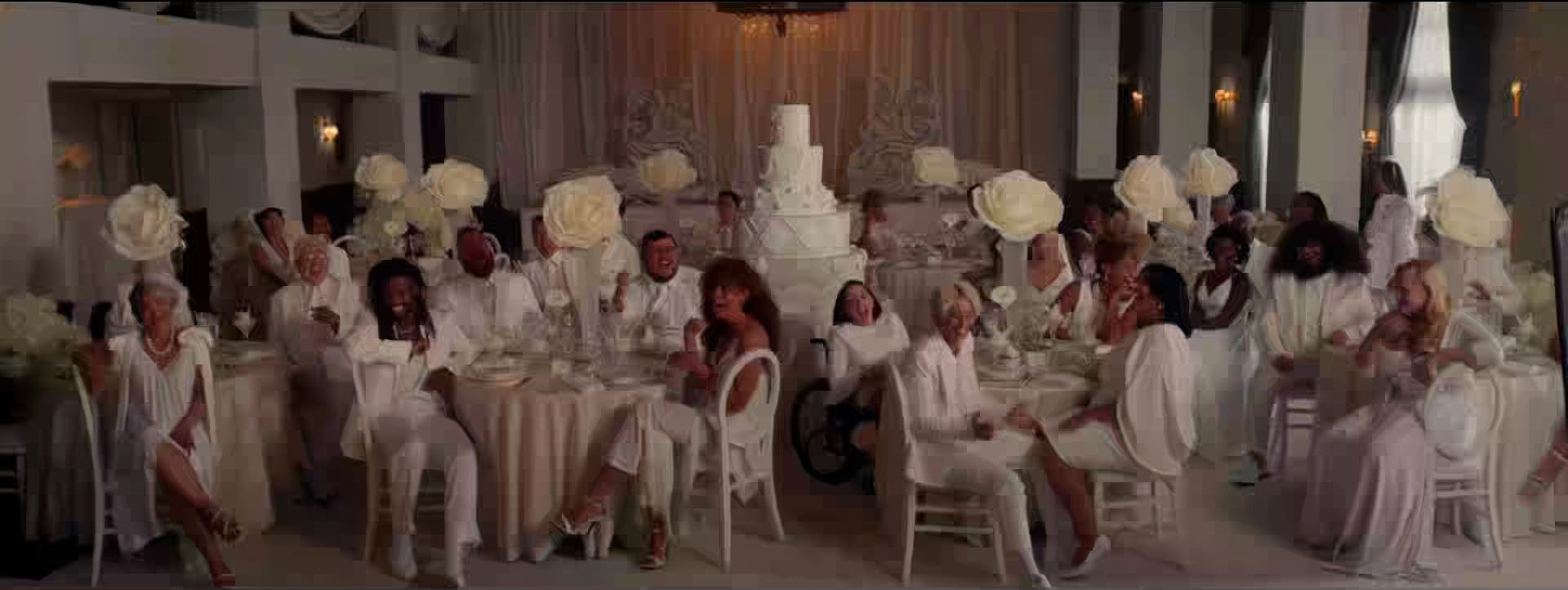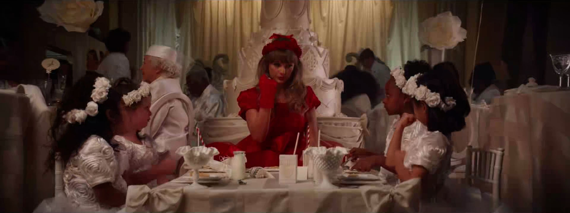 The video documents a wedding, with the wedding couple played by actor Miles Teller and his wife Keleigh Sperry Teller.[41] Swift plays an ex-girlfriend who intrudes upon the wedding.[42] Co-producer Aaron Dessner has a cameo as a member of the wedding band, while Swift’s brother, actor Austin Swift, is credited as a producer for the music video.[43] The six-minute video begins with Teller, at his wedding party, having flashbacks to his and Swift’s failed relationship. At the wedding ceremony, Swift knocks over the groom figurine on top of the cake, chugs wine after giving a toast, and goofs off with children guests.[44] The video contains references to other Swift music videos and All Too Well: The Short Film, as well as multiple references to the Lewis Carroll stories of Alice’s Adventures in Wonderland and Through the Looking-Glass. Swift had been asked about Easter eggs prior to the release, quoting Carroll in response.[45][46]